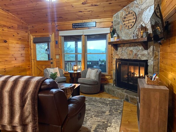 Our 2 bed/2 bath cabin is tucked away in the mountains and surrounded by breathtaking views. If you aren’t spending your time inside relaxing, enjoy a soak in our hot-tub, or a bonfire with a view. Wood is provided! If you must, work in this clean space with great Wifi. The main deck is screened in with a gas firepit to be enjoyed 365 days/year, rain or shine. Step outside to the open-air portion of the deck to grill out or enjoy a beverage in the tall chairs. The kitchen is fully equipped to cook a delicious meal. We supply the essentials like coffee K-cups, soap, shampoo, paper towels, toilet paper, laundry & dishwashing detergent, trash bags, and the other items listed in the amenities. You're also welcome to bring your own ground coffee, since the coffee maker is dual-purpose. Just bring food and drinks, and we take care of the rest!