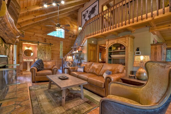 At night, witness the spectacular sunset over the North Georgia Mountains before retiring to one of the inviting bedrooms, each adorned with luxurious sheets and pillows for a restful night's sleep. With a king bed on the main level and two additional bedrooms on the upper level, as well as a queen sleeper sofa on the lower level, the cabin comfortably accommodates families or groups.