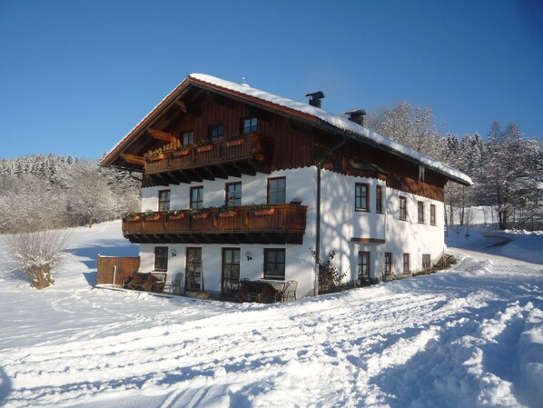Die Wohnung befindet sich in unserem Landhaus mit herrlicher und unbebauter Sicht zu den Bergen des Bayerischen Waldes.