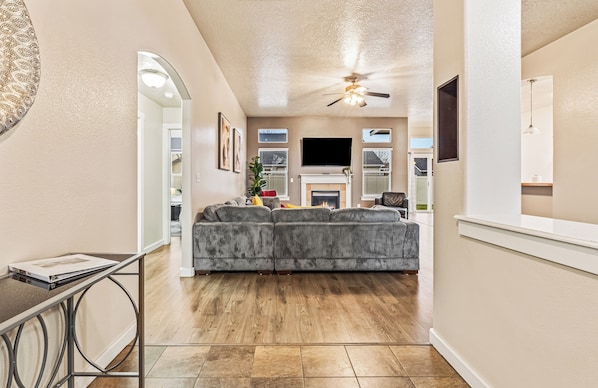 NAGELNEUE LISTE! Neu aktualisiert, privat + einzigartiges Haus mit hohen Decken, viel Tageslicht + modernes Dekor. Schlafmöglichkeiten für 6 - offener Grundriss, 3-Bett / 2-Bad mit Hartholzböden, Spielzimmer mit Tischfußball und Airhockey, Kamin, Master mit Badewanne und Dusche, großer begehbarer Kleiderschrank. Hauptschlafzimmer mit KING-Bett und weicher Baumwollbettwäsche, Highspeed-WLAN, Kabel, 65-Zoll-Flachbild-Smart-TV. Nur wenige Schritte zum Gemeinschaftspool, Parks & mehr! Ausreichend kostenlose Parkplätze!