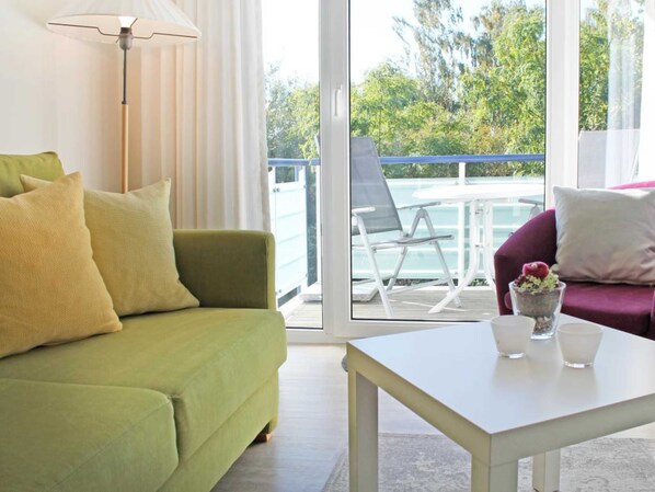 Die 2-Zimmer-Ferienwohnung mit Balkon, bietet auch Allergikern einen entspannten Aufenthalt und befindet sich in der 1. Etage des Hauses. Es empfängt Sie ein modernes Appartement mit einer Wohnfläche von 50qm, in dem Sie mit 2 Personen Ihren Ostseeurlaub verbringen können. Der saisonal möblierte Balkon ist umlaufend und lädt zum Sonnenbad ein. Im Wohn-/Essbereich mit bequemer Sitzgarnitur und Relax-Sessel, befindet sich auch eine offene Wohnküchenzeile, in der Herd, Backofen, Mikrowelle, Spülmaschine ebenso vorhanden sind, wie Toaster, Wasserkocher und Kaffeemaschine usw. Für technische Unterhaltung sorgen ein Fernseher mit SKY Progarammen, DVD-Player, Musikanlage sowie ein gebührenfreier Internetzugang über WLAN. Ihre Nächte verbringen Sie in einem separaten Schlafzimmer mit Doppelbett und Kleiderschrank. Die Wohneinheit besitzt ein innenliegendes Duschbad. Allen Hausgästen stehen Waschmaschine und Wäschetrockner gegen Münzeinwurf zur Verfügung. Für Ihren PKW ist ein kostenfreier Außenstellplatz am Haus reserviert. Da das Ferienappartement für Allergiker geeignet ist, darf in der Wohnung nicht geraucht werden. Auch Haustiere sind nicht erlaubt. Optional sind Bettwäsche sowie Handtücher gegen Gebühr zu buchbar. Für das beziehen der Betten wird eine gesonderte Gebühr erhoben.