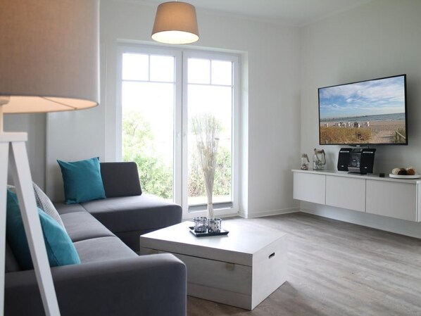 Im offenen Wohn-Essbereich empfängt Sie ein Komfortsofa, welches als ausziehbares Sofa zwei weitere Schlafgelegenheiten ermöglicht.