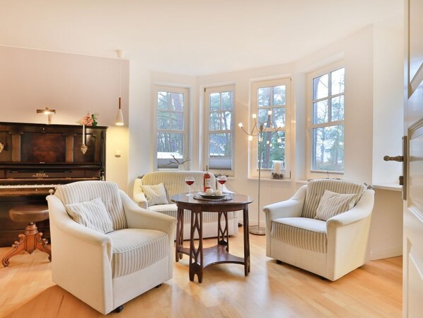 Die 2,5 Zimmer Suite Möwe- mit Terrasse, bietet eine großzügige Wohnfläche von 60qm und ist ideal für zwei Gäste. Sehr komfortabel empfängt Sie der gehoben möblierte Wohn-Essbereich mit einer bequemen Sofagarnitur, Kaminofen, Schreibplatz, Klavier, Fernseher. WLAN nutzen Sie kostenfrei. Die offene Einbauküche, mit Esstischtisch, ermöglicht vorteilhaft die Selbstversorgung mit: Ceranfeldherd, Backofen, Dunstabzug, Kaffeemaschine, Wasserkocher, Toaster u.v.m. Hervorzuheben ist der charmant möblierte Wintergarten mit Blick in den Waldpark und Zugang zur Terrasse, die Sie über fünf Stufen erreichen. Erholsam schlafen Sie im separaten Schlafzimmer mit Doppelbett, Kleiderschrank und einem Sekretär. Bei Anreise sind Ihre Betten bereits für Sie bezogen und Handtücher liegen bereit. Das vom Schlafzimmer zu betretene Tageslichtduschbad ist mit einer Dusche, Waschtisch, Föhn und WC ausgestattet. Allen Hausgästen steht der 2000qm große Garten mit schattigen Ruhezonen und Gartenliegen zum Entspannen zur Verfügung. Ihr Fahrzeug parken Sie bequem auf einem fest zugeordneten PKW-Außenstellplatz, direkt vor dem Haus.