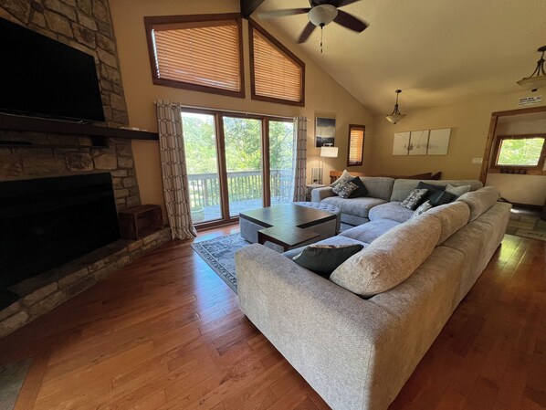 Bei Ihrer Ankunft finden Sie einen geräumigen Parkplatz für 4 große Fahrzeuge und einen kurzen Gehweg, der in die obere Ebene der Kabine führt. Der Felsen hat 3 Niveaus, wobei das obere Niveau die Küche, das Esszimmer, das Familienzimmer und ein halbes Bad enthält. Auf der zweiten Ebene finden Sie das Hauptschlafzimmer mit eigenem Bad und eigenem Balkon mit Blick auf unseren kleinen Bach sowie zwei weitere Schlafzimmer (1 Queen und 1 King) mit einem weiteren Vollbad. Das Erdgeschoss hat einen Schlafraum und ein Spielzimmer, diese Zimmer teilen sich ein Vollbad. Das Haus ist mit der Marke Biltmore Bettwäsche und Handtücher für den Komfort unserer Gäste bestückt. Wir haben eine professionelle Keurig-Kaffeemaschine mit einer Vielzahl von K-Tassen zur Verfügung.