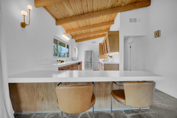 Immaculate Mid-Century De Anza Golf Course home, completely remodeled with luxurious furniture offering 3 bedrooms and 3 full bathrooms. No expense was spared in bringing this 1957 architectural gem back to its original glory, all with appropriately modern upgrades. A large primary bedroom with a full bath, and two queen bedrooms, one with a private full bath and one with a full bath across a hallway. Great views from every direction and is suitable for up to 3 couples or as a romantic retreat for two. This is a new listing and if you are a lover of Mid-Century Architecture, you will fall in love with this beautiful home.