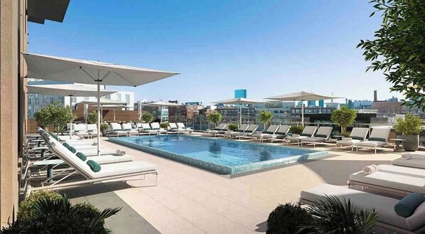 During your stay you will also have access to the building's endless shared amenities, where shared spaces beckon with relaxation and excitement. Dive into the shared pool area, where sun loungers line the edges, inviting you to unwind with city skyline views as your backdrop. Find tranquility in comfortable outdoor seating, creating the perfect haven. Venture upward to the rooftop, where additional seating spaces await, providing a cozy setting for evenings with family and friends around a warm fire pit. Stay on track with fitness goals in the fully equipped gym, boasting modern equipment. For sports enthusiasts, indulge in soccer and golf simulations, adding an extra layer of enjoyment to your community experience.