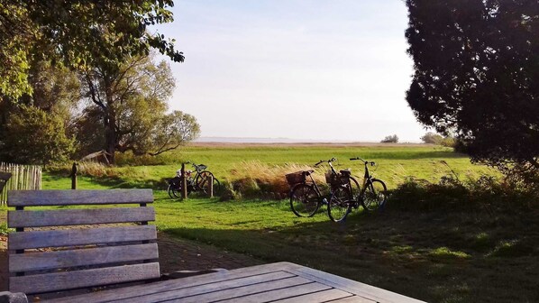 Die 64 qm große Ferienwohnung befindet sich in der oberen Etage und ist für bis zu 5 Personen geeignet. Die 2 Zimmerwohnung ist gemütlich und komfortabel eingerichtet. Im Wohnzimmer ist eine große Eckcouch mit einer Essecke, es gibt digitales TV, DVD-Player und ein Radio mit CD. Ausgestattet ist das Schlafzimmer mit einem Doppelbett, einer Liege (Aufbettung) und einem großen Kleiderschrank. In der vollausgestatteten Küche finden Sie ein 4 flammiges Ceranfeld, Backofen, Kühlschrank, Geschirrspüler, Kaffeemaschine, Mikrowelle, Toaster und eine Brotschneidemaschine. Das Badezimmer ist mit einer Eckbadewanne ausgestattet.
