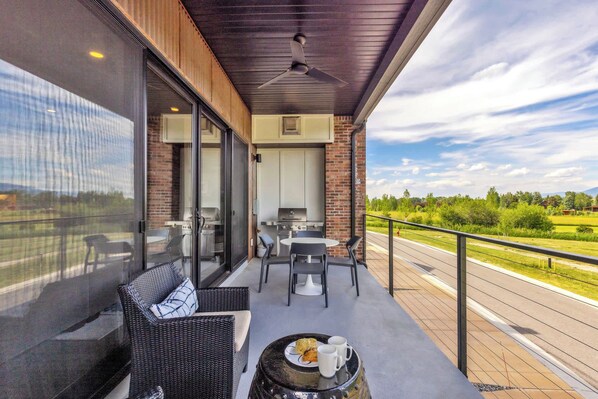 -Living Room Balcony (Main Level): Equipped with a BBQ grill and views of the Bridgers, this is a great gathering space for sunset dinners and grilling.