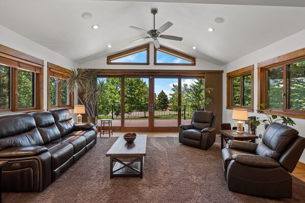 - Lower-Level Family Room: Comfy couches, pull-out sofa, large flat-screen TV, and game table.