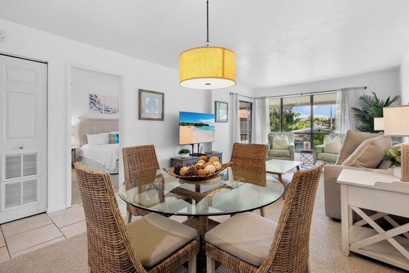 The inviting interior boasts a relaxed, open layout with coastal decor, creating a comfortable retreat after a day at the beach. The living area’s plush sofa, convertible into a queen sofa bed, and large TV provide a cozy space to unwind, while the adjoining dining area offers a casual spot for sharing meals. The fully equipped kitchen has all essentials for cooking at home, with a screened lanai extending your living space outdoors.