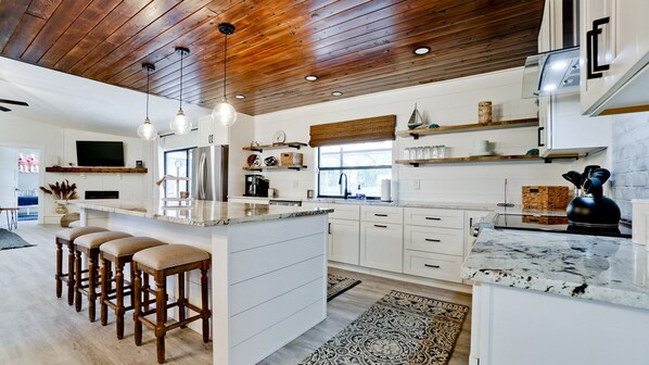 There is a beautiful, fully equipped kitchen open to the rest of the living space because we always hang out by the food! The kitchen includes stainless steel appliances, granite counters, and LARGE center island FOR COOKING!