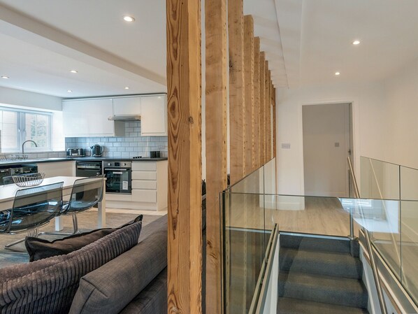 Bathroom: Bath With Shower Attachment, Walk-In Shower, Heated Towel Rail, Toilet. Electric central heating, electricity, bed linen, towels and Wi-Fi included. Welcome pack. Grounds with terrace, sitting-out area and garden furniture (shared). Gym (shared with other properties on-site). Bike store. Private car park; additional on road parking. No smoking. Please note: There are steps in grounds and the neighbouring shared hotel lawns border the river.. This first floor apartment has its own private entrance and boasts open plan modern accommodation, a super kingsize bedroom (can be twin beds by prior request) with quality linens, and a well-equipped kitchen, great for dining in. Being just minutes away from the high street, there are plenty of eateries within walking distance, and why not enjoy a ‘hearty and bottomless’ breakfast at the owners’ hotel, just a few minutes’ walk along the road (120m).