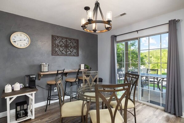 Dine inside or outside on the covered patio at the table for 4. Grill using the shared condo grill in back of condo building.
