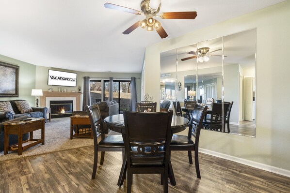 Looking for a perfect blend of relaxation and recreation? Our two-bedroom condo situated near the bustling entertainment district of Branson is an ideal choice for you. It is located on a golf course, offering stunning views of the first hole, and a short walk to Lake Taneycomo. So, you can enjoy a serene retreat amidst the excitement of Branson. As you step inside, you'll find a well-appointed space that features a full kitchen with stainless steel appliances, a breakfast nook, and a dining table with four chairs and two additional barstools for added seating. The living area is designed for comfort and style, with a wet bar, sleeper sofa, decor-only fireplace, and a large Smart TV with cable access. The condo boasts two spacious bedrooms, one with a king-sized bed and the guest room with a queen-sized bed, ensuite bathroom, closet space, and cable TV. Outside, the patio provides a picturesque setting for morning coffee or al fresco meals, overlooking the golf course.