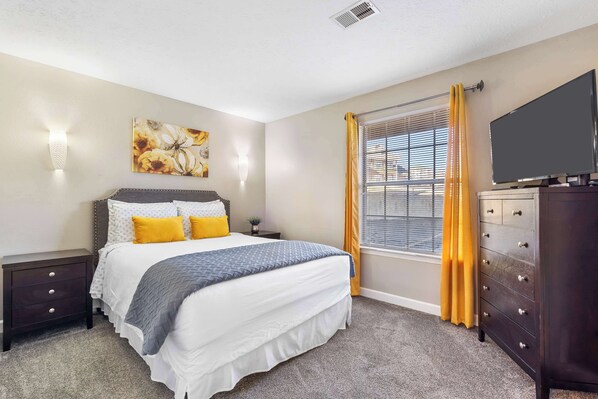 Inside, Windsor Cottage offers all the amenities you need for a comfortable stay, including a private bedroom with a luxurious queen-size bed and a full ensuite bathroom with a dual vanity and shower/tub combo. Additional conveniences include a washer and dryer and parking right outside the door.