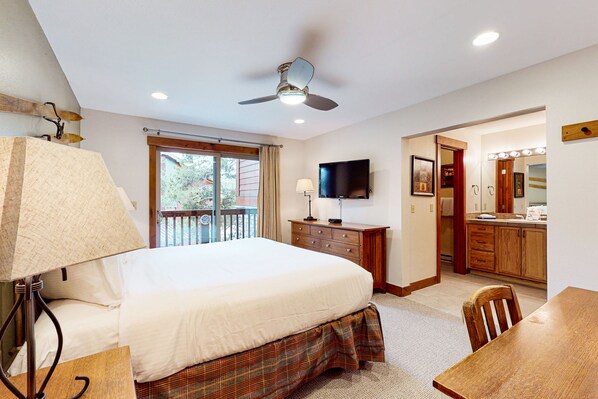 Mountain views, and a great location steps away from the community pool and hot tubs make this second-floor condo a wonderful vacation choice! The spacious living room looks out to the slopes through big windows and a private balcony. A large TV with a DVD player and a selection of family games are available to pass the time warmed by a blazing fire in the wood-burning fireplace (firewood provided). Black-out curtains block out both light and noise. The updated kitchen features a new tile floor, cabinetry, and a breakfast bar. Right next to the kitchen is a lovely wood and iron dining set. The spacious primary suite has a big bed, a private balcony, a second TV, and a private safe for valuables.