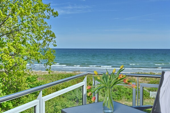 Auch aus der Unterkunft genießen Sie die Nähe zum Strand und den weiten Blick über das Meer. KALA verfügt über einen Nord-Balkon und eine Süd-Dachterrasse, ein Schlafzimmer mit Doppelbett und einen großzügigen Wohnbereich mit Ethanol-Kamin und integrieter Küche und Essbereich.