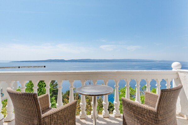 Der Balkon mit Sitzbereich im Freien bietet Meerblick.
