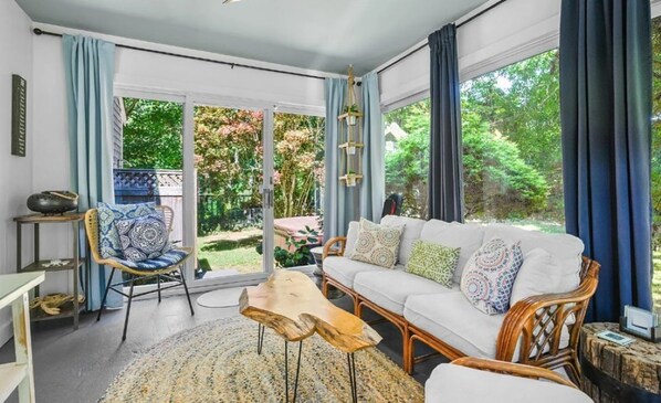 Also on the main level is a large open-concept kitchen, sitting area, and TV room. There is a built-in banquet style dining table that expands to seat up to 8 people (10 if you squeeze?!). Off the kitchen is a bright sun room to enjoy your morning coffee, or to get some work done. There is central air throughout the entire main house. There are also ceiling fans in 2 of the 3 bedrooms and the sunroom.