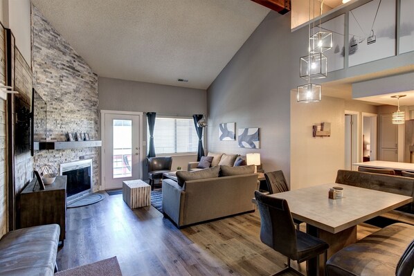 Diese luxuriöse Wohnung ist mit allen Annehmlichkeiten ausgestattet, die Sie für einen unvergesslichen Urlaub benötigen könnten. Das Wohnzimmer verfügt über Gewölbedecken und ist mit einem Queensize-Schlafsofa, einem Flachbild-TV und einem einladenden Kamin ausgestattet. Treten Sie aus dem Wohnzimmer auf den Balkon, um die Aussicht auf die Berge zu genießen.