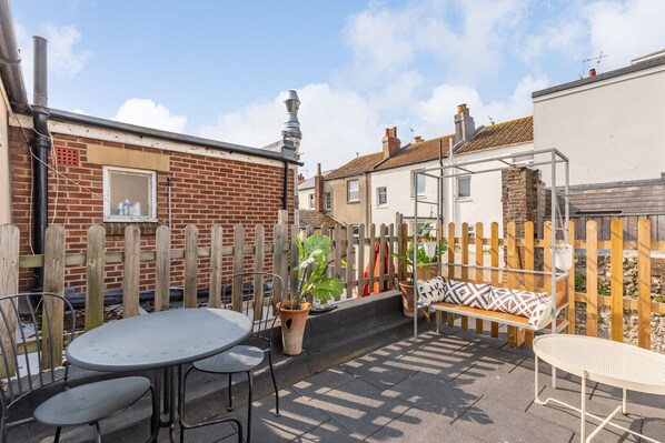 The street is lined with lots of independent shops, cafes, restaurants and bars. You are right in the heart of Brighton. The apartment is bright and newly decorated and furnished. The bedroom is at the back of the building and opens up on to a sunny roof terrace, a great place to chill out before you head out to explore the surrounding area.