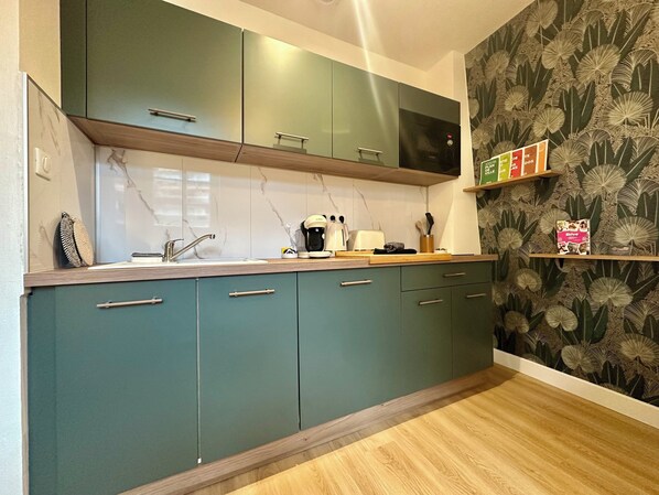- A FULLY EQUIPPED KITCHEN: Prepare delicious meals just like at home. You'll find: a stovetop, microwave, refrigerator/freezer, as well as a Tassimo coffee machine, a kettle, a toaster, and all the necessary cooking utensils.