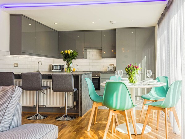 Kitchen area: Breakfast Bar, Electric Oven, Electric Hob, Microwave, Fridge/Freezer, Dishwasher, Coffee Machine, Patio Doors Leading To Courtyard