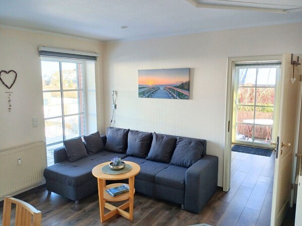 Die 2-Zimmer Wohnung Küstenliebe liegt im Parterre und hat ca. 40 m² Wohnfläche, bestehend aus: Wohnzimmer mit Schlafcouch (Liegefläche ca. 140x200 cm - einteilig), Esstisch mit 2 Stühlen und Bank, Smart-TV, CD-Radio, kostenfreies WLAN; Schlafzimmer mit Boxspringbett (160x200 cm, einteilige Matratze), Kleiderschrank; Küchenzeile im Wohnzimmer mit 4-Feld-Ceranfeld, Backofen, Kühlschrank mit Gefrierfach, Mikrowelle, Kaffeemaschine, Wasserkocher; Dusche/WC; eingezäunte, möblierte Terrasse zur Süd-Ost-Seite; PKW-Stellplatz; Nichtraucher!