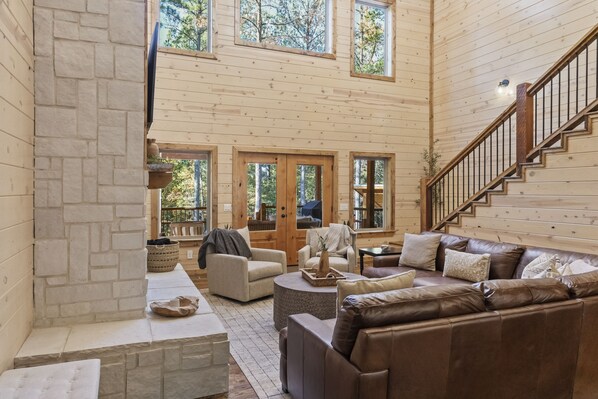 After navigating through the kitchen, you’ll find yourself in the spacious living room, featuring a stunning, rock-faced, gas-log fireplace with a large smart TV perched atop its mantle for your viewing pleasure. The enormous leather sectional provides ample seating for guests to enjoy watching TV or just visiting. There is also a half bathroom located downstairs for your convenience.