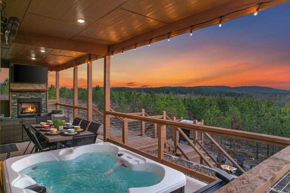 “Sunset Bliss” perfectly describes what you’ll experience as you take in epic panoramic mountain + sunset views from this cabin’s patio + balcony. Gather your family/large group – and doggo – at this gem of a cabin. Have a blast playing indoor and outdoor games – foosball table, shuffleboard, Infinity game table, cornhole, and horseshoes. Enjoy a luxurious soak in the hot tub and make memories around the firepit. Take advantage of Sunset Bliss’s central location in the heart of Hochatown - close to everything!