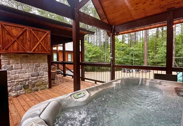 ✔ Covered back patio with a gas grill, hot tub, and plenty of seating