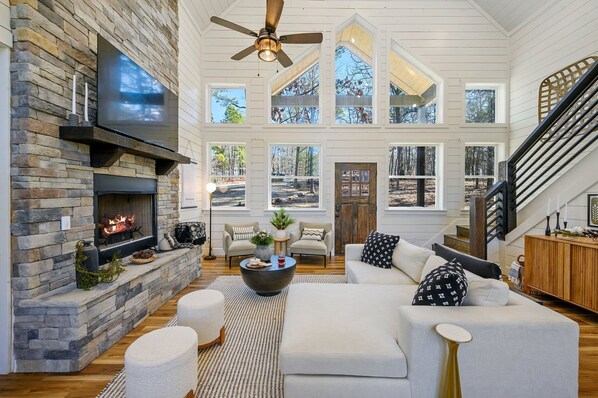 There are plenty of games, books, puzzles, cards and even an arcade system to make you and your family feel right at home. No devices necessary here for entertainment! It has an open concept feel with high ceilings, a large living area, and kitchen that flows nicely into the dining area- all on the first floor. The living room has a beautiful fireplace and smart television. The bottom floor has 2 master king bedroom suites with connecting oversized bathrooms and a 1/2 bath located in the hallway just off of the kitchen area.