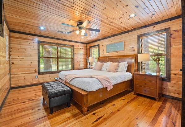 At Forever Young, comfort and space come naturally. This charming cabin is ideal for two couples or a small family looking to relax and recharge. Both master suites feature plush king beds and HDTVs with DirecTV, and each offers its own touch of luxury—one with a full bath, custom tile shower, and a dreamy clawfoot soaking tub, and the other with a Blue-ray DVD player for cozy movie nights. In the living room, you'll find a queen sleeper sofa and a gas fireplace (perfect between October 15th and April 15th!) setting the scene for lazy evenings together.