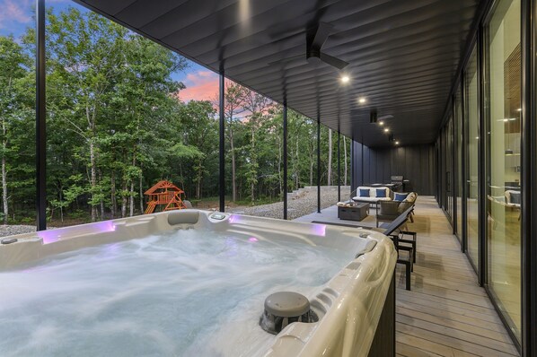 Escape to a modern sanctuary in the heart of nature—a linear cabin nestled amidst the peaceful woods. Its sleek standing seam metal and hardwood exterior exudes contemporary elegance. With generous 10 ft windows and sliders, immerse yourself in the breathtaking 180-degree panoramic views. Discover ultimate tranquility and seclusion in this family retreat, complete with 3 master suites boasting private balconies. Every corner reveals spacious, meticulously designed interiors, ensuring a luxurious and unforgettable experience.