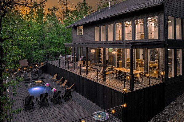 Step into this spacious two-story Woodland Hills cabin, featuring vaulted ceilings and floor-to-ceiling windows that fill the open-concept living space with natural light. Sliding doors open to a massive two-story deck with a private pool, creating seamless indoor-outdoor living. The covered dining area with grill and spacious outdoor seating make entertaining easy, while the fire pit in the woods provides the perfect setting for evening gatherings. Guests will also enjoy a private playset for children.