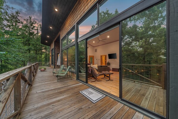 Beautiful breezeway that leads you to the back of the cabin, offering plenty of outdoor seating to fully immerse yourself in the tranquility of the woods.