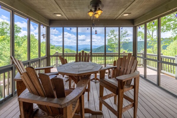 We enjoyed the gorgeous property, especially the screened in porch and hot tub. We traveled with another couple and appreciated that both bedroom spaces had a king bed and separate bath so neither couple felt like they were getting a down grade, even in the lofted space. The only downside was the 30ish minute drive from downtown Bryson City up a winding road…but that winding road leads to a quiet neighborhood at the top of a hill with unobstructed views and beautiful sunsets.