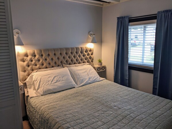 -Queen bed with 4 pillows, linens, comforter