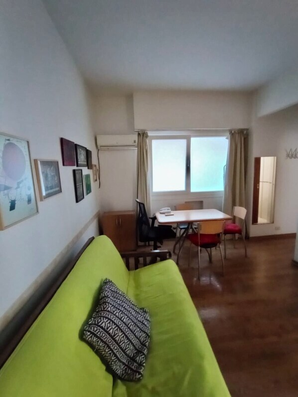 Were you looking for a comfortable apartment steps from the Obelisk to enjoy the Buenos Aires nightlife? You found it! Setting: Well-located building in the Tribunales area, in the heart of downtown Buenos Aires, steps from the Teatro Colón. With a front setback, well-maintained, with 4 apartments per floor. Advantages: This is for temporary living and also suitable for professional use. It does not have a kitchenette; it has a separate kitchen with a sliding window. Air conditioning and natural light. High marble countertop. Wood-colored cabinets with shelves. Equipped with a refrigerator and dishes.