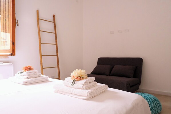 This listing is for 1 double bedroom, one kitchen/living area with a small sofa bed, PLUS an extra sofa bed in the big bedroom and an outdoor patio with shower.