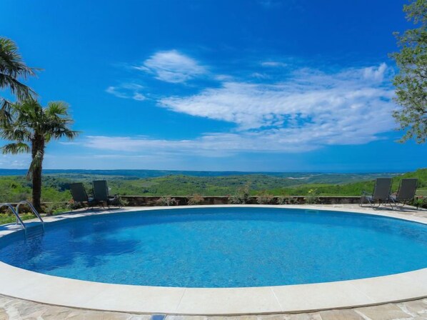 Krasica, 4 km von Buje: Rustikaler, komfortabler Landsitz "Villa Plac". Ausserhalb des Ortes, alleinstehende, sonnige Lage auf einem Hügel, direkt am Waldrand, 16 km vom Meer, im Grünen. Zur Alleinbenutzung: Grundstück 12'000 m2, gepflegter Garten 3'000 m2 (eingezäunt) mit Rasen, Liegewiese, Schwimmbad (11 x 6 m, 125 - 170 cm tief, saisonale Verfügbarkeit: 01.Mai. - 30.Sep.). Aussendusche, Poolhaus mit WC, Laube, Gartenmöbel, Grillhaus. Im Hause: Internetzugang, Waschmaschine. Wohnungsreinigung möglich (extra). Parkplatz beim Haus auf dem Grundstück. Supermarkt 4 km, Restaurant 500 m, Bushaltestelle 4 km, Bahnstation 33 km, Kieselstrand 16 km, Strandbad 16 km. Sportzentrum 16 km. Ab Hof Verkauf von bäuerlichen Produkten. Poolhaus, 50 m2, mit Küche (4 Herdplatten, Backofen, Kühlschrank) und grossem Esszimmer. Schöner Garten mit hübscher Sicht auf die hügelige Landschaft mit Olivenhainen sowie Weitsicht auf das Meer.