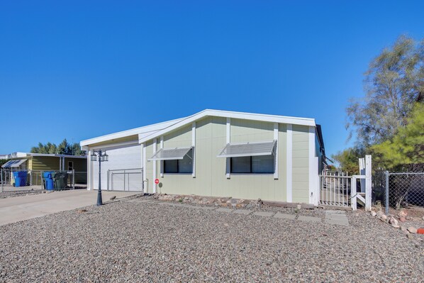 Verweilen Sie während Ihres Aufenthalts auf dem umzäunten Garten. Mit einer Feuerstelle und einer Wüstenlandschaft ist der Hof der perfekte Ort, um einen entspannten Abend unter dem Wüstenhimmel zu genießen.