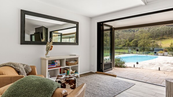 The main homestead offers three well appointed bedrooms, including a master bedroom with an en-suite, and a second bathroom that serves the additional two rooms. Thoughtfully designed indoor and outdoor living spaces extend out to a sparkling pool, multiple alfresco dining spots, and a cosy fire pit—perfect for unwinding under the stars.