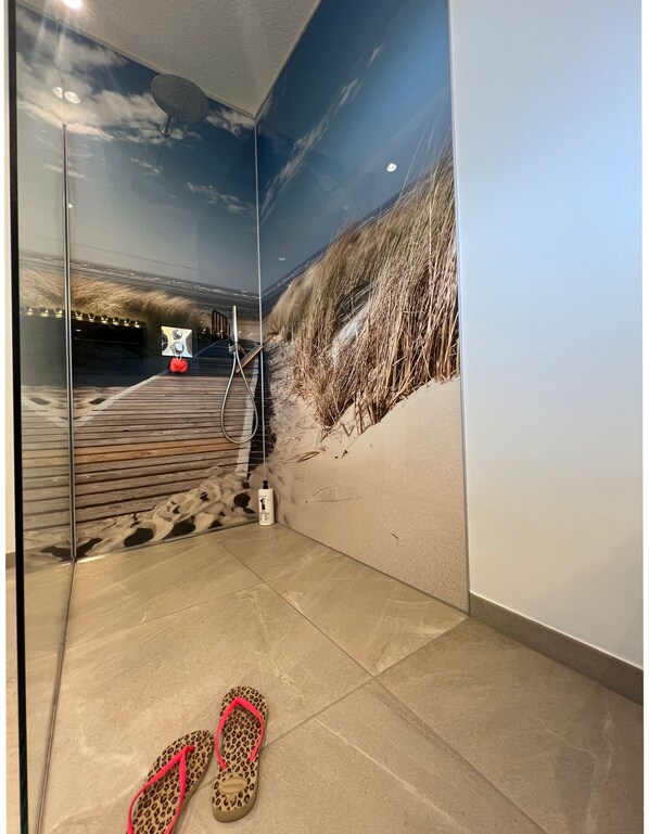 3-RAUM LUXUS-FERIENWOHNUNG, CA. 90 QM FÜR 2-4 PERSONEN Wohnraum mit Wohnzimmerschrank, Couchgarnitur, 1 Sessel, SAT-Smart-TV, Stereoanlage, Deckenstrahler, Laminatböden, hochwertige Teppiche, große Kaminwand, Terrasse mit Strandkorb und Gartenmöbel 1 Schlafraum mit Doppelbett, 2 Nachttischen, SAT-Smart-TV, großem Kleiderschrank, Wertfach 1 Schlafraum mit 2 Einzelbetten, großem Nachttisch, Kleiderschrank Separate Küche mit Essecke: Küchenzeile mit 4 Platteninduktionsherd inkl. Backofen, Spüle, Kühlschrank, Abzugshaube und Geschirrspülmaschine, Geschirr und Hausrat, Kaffeemaschine, Mikrowelle, Wasserkocher und Toaster 1 großes Bad mit Erlebnisdusche, WC, Waschbecken, Spiegelschrank, Föhn 1 Bad mit Dusche, WC, Waschbecken und Spiegelschrank