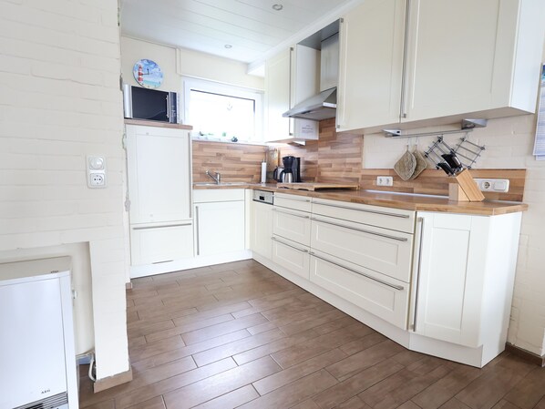 Ein Schlafzimmer mit Doppelbett 180 x 200, ein weiteres Schlafzimmer mit Etagenbett unten 90 x 200, oben 90 x 200, sowie ein seniorengerechtes Einzelbett 90 x 190 aber höher gebaut. Hier ist auch eine Kinderspielecke mit ausreichend verschiedenen Spielsachen und Büchern eingerichtet. Viel Stauraum für Ihre Sachen finden Sie im Schlafzimmerschrank. Ein Kinderreisebett und ein Hochstuhl auch zu Ihrer Verfügung. Die moderne Küche verfügt über einen Kühlschrank mit Gefrierfach, eine Mikrowelle mit Grill und Backofen, ein Touch - Ceranfeld, eine Spülmaschine und alle üblichen Kleinelektrogeräte. Ausreichend Geschirr, Töpfe Gläser, Besteck, sowie Kinderbesteck und Becher. Gemütlicher Essplatz für 5 Personen, Wohnzimmer mit gemütlicher Sitzecke, großem Flachbildschirm mit SAT-TV, Radio, MP3-Player, DVD-Player, kostenloser schneller DSL Anschluss, Kaminofen. Auf der südwärts angelegten Terrasse mit angrenzendem Rasen, auf dem sich ein Sandkasten und eine Schaukel befinden, kann man es sich unter der Markise gemütlich machen. Es sind ausreichend Stühle und Liegen, ein großer Tisch sowie ein Grill vorhanden. Im Gartenhaus ist ein Wäschetrockner untergebracht. Weiterhin befindet sich neben dem Gartenhaus kostenloses Brennholz für den gemütlichen Kaminofen. Eine Waschmaschine, sowie Staubsauger und Putzmittel sind selbstverständlich vor Ort.