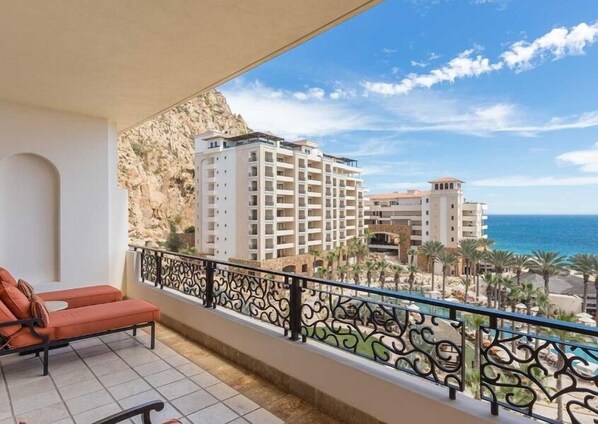 Diese Master Suite mit einem Schlafzimmer ist die perfekte Kombination aus Platz und Privatsphäre. Es gibt keinen besseren Weg, diese elegante Suite mit Blick auf den Pazifischen Ozean zu beschreiben. Es verfügt über eine voll ausgestattete Küche mit Marmor-Wet-Bar, Wohnzimmer, Esszimmer, zwei Badezimmer mit Marmor-Theken und Fußböden und einen begehbaren Kleiderschrank. Die raumhohen Glasschiebetüren öffnen sich auf einen großen privaten Balkon und eine private Terrasse mit Blick auf den Pazifik und den Privatstrand und die Pools von Grand Solmar.