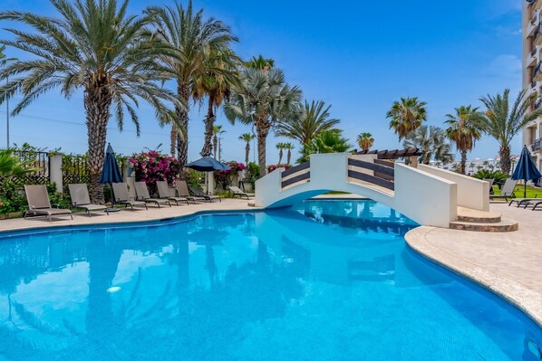 Staff at the gate were friendly and helpful. The beach is a five minute walk. Condo has beach towels, chairs, an umbrella, cooler, and wagon making a beach day a breeze.