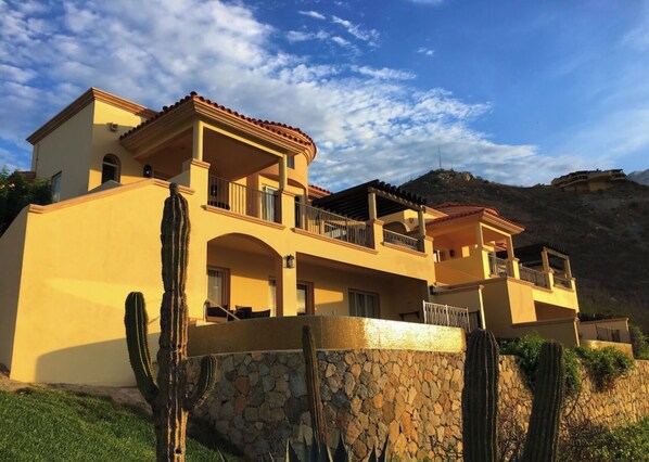 Enjoy this private luxurious, hillside villa in the safety of the world renown Pueblo Bonito Montecristo Estates. This stunning villa has the most spectacular sunset views over the Pacific Ocean, its own private infinity pool and jacuzzi, large fully equipped gourmet kitchen, inside and out dining areas and two different living areas. The two large Master bedrooms include King size beds. The third bedroom has two queen size beds. All bedrooms have private bathrooms and large walk-in closets. The downstairs living room has a sofa sleeper.