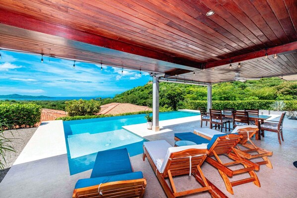 The infinity pool is stunning and offers an amazing place to capture some of the best ocean and sunset views along the coast! The covered terrace area features a gas BBQ, lounge furniture, outdoor dining, and a large coralina stone deck, perfect for morning yoga and evening star-gazing.