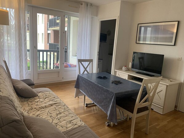 Vom ersten Moment an werden Sie die warme und funktionale Atmosphäre spüren. Das geräumige und helle Wohnzimmer ist mit einem bequemen Schlafsofa ausgestattet und schafft einen einladenden Raum. Es öffnet sich zu einem privaten Balkon.